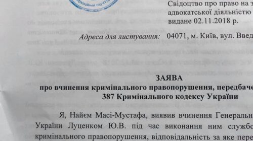Адвокат Масі Найєм подав до Державного бюро розслідувань заяву на генпрокурора Юрія Луценка. Про це юрист написав у Фейсбуку, повідомляє «Український репортер». Заява стосується правопорушення, передбаченого ч. 2 статті 387 Кримінального кодексу – розголошення відомостей досудового розслідування у справі про вбивство Катерини Гандзюк. Масі Найєм так пояснив своє рішення: «Йдеться про розголошення, вчинене прокурором (незалежно від того, чи брав він безпосередню участь у досудовому розслідуванні), яке може призвести до негативних наслідків для розслідування. Наприклад, публічне оголошення про намір повідомити певним особам про підозру може дати чіткий сигнал таким особам про…