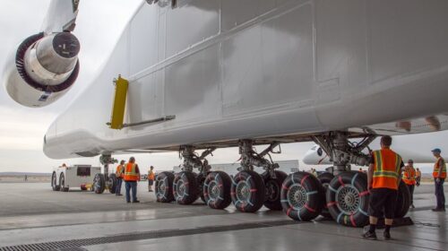 Маса літака – 250 тонн, а з повним навантаженням – 590 тонн. Він має 28 коліс і шість двигунів від Boeing 747.
