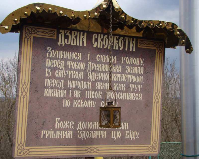 «Зупинися та схили голову. Перед тобою – древлянська земля із смутком ядерної катастрофи. Перед народом, який жив тут віками і як пісок розсипався по всьому світу. Боже, допоможи нам, грішним, здолати цю біду!»