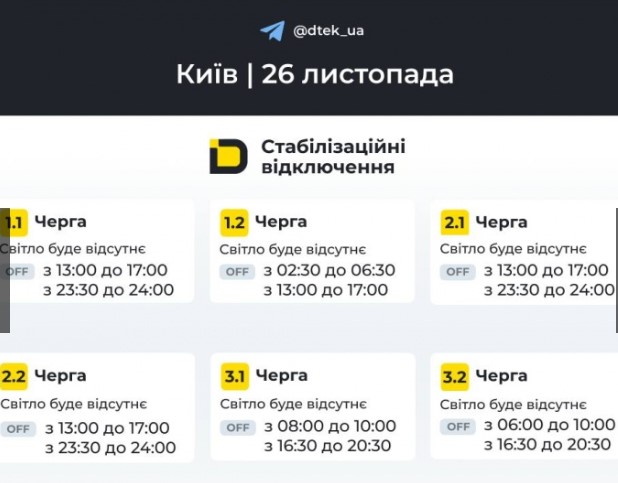 У середу, 26 листопада, у Києві й надалі діятимуть графіки відключень електроенергії. Максимальна тривалість одного відключення сягатиме чотири години.