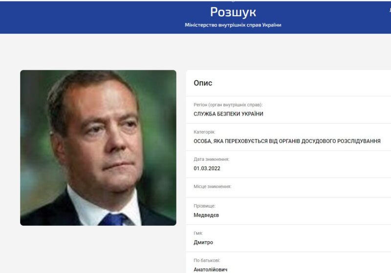 Нагадаємо: ще у 2022 році Служба безпеки України оголосила в розшук Дмитра Медведєва.