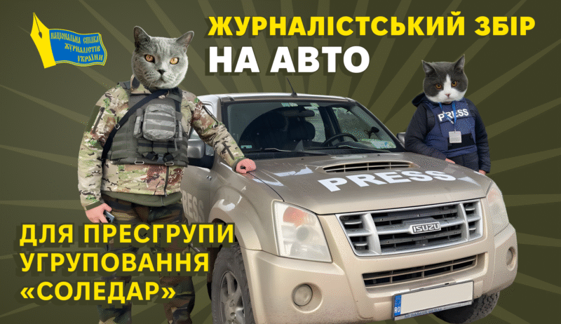 Національна спілка журналістів України хоче допомогти покращити умови роботи журналістів на фронті. Оголошується новий збір на автомобіль для пресгрупи оперативно-тактичного угрупування «Соледар» ЗСУ.
